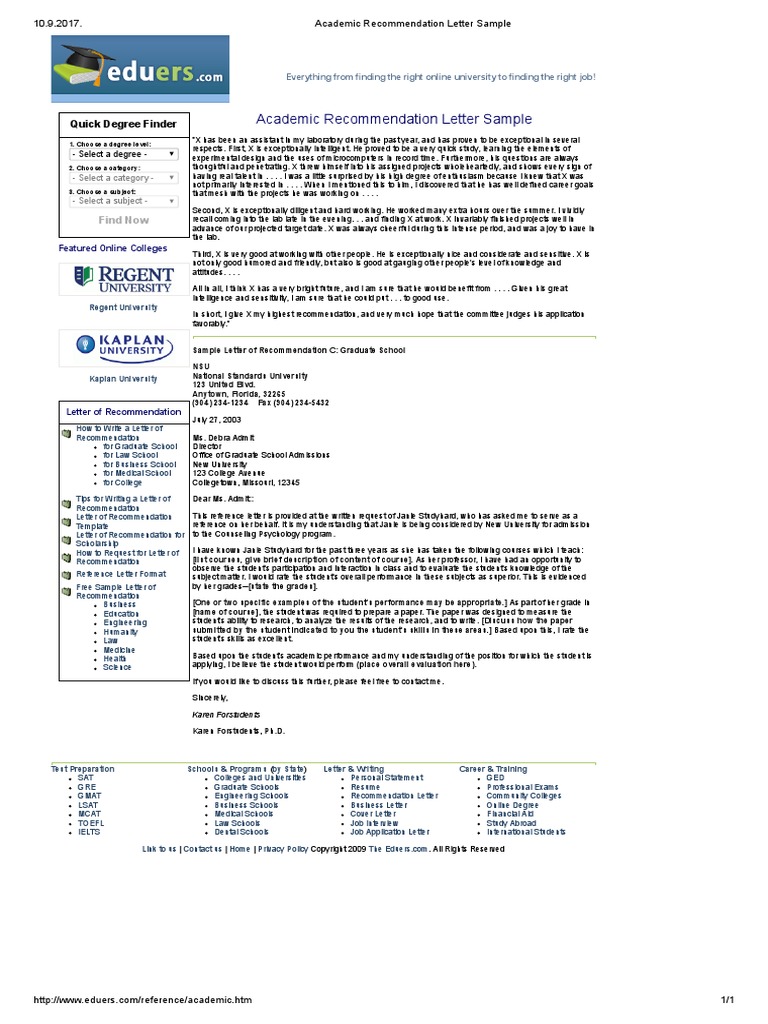 Academic Recommendation Letter Sample Graduate School Graduate Record Examinations